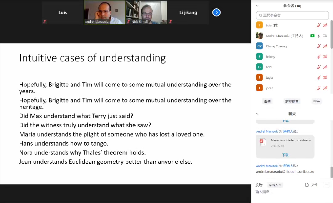 第一次课上,Andrei进行了“认识论理解的优点”的主题讲解。老师通过直观的案例对美德、理解与知识、对比与和睦进行深刻而现实的分析,并且提出了有多少美德认识论需要理解?第二次课上,Andrei进行了“借助因果关系理解”的主题讲解。讲解了科学解释的核心问题:现象之间的关系是什么?是什么让人理解了所解释的现象?并且解释了演绎法则论的解释模型,例如:零是一个数字;如果N是一个数字,N的继承者是一个数字;那么继承者相等的两个数字本身相等;第三次课上,Andrei讲述了把握现象理论的重要性、需要有意识地进行把握和理解、以及对于问题进行有意识的想法和理解后解决问题;第四次课上,Andrei主要讲述了有关论文写作的问题以及表达了对H视频