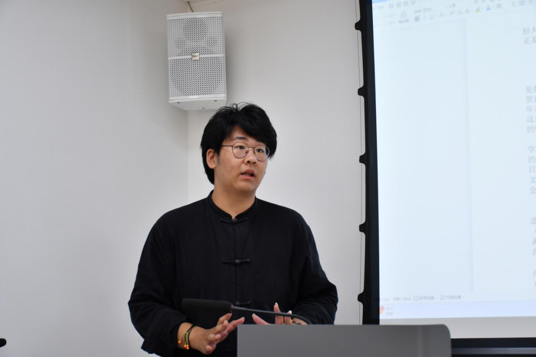 随后,2022级本科生刘书源同学就自身有关日本无赖派文学的阅读体会与哲学视角相结合,以“论日本无赖派之罪感”为主题,从“无赖派的诞生”、“无赖派特点”“无赖派的罪感与方向”三个部分出发做了主题分享。刘书源同学首先综述了日本战后无赖派文学的发展与其在现代中国的研究进程,随后介绍了以太宰治、坂口安吾为代表的无赖派的“堕落”“孤独”“自由”等特质,并从其创作方法、文风以及文学与现实的关系等方面,讨论了无赖派小说其内部的批判精神与革新价值。