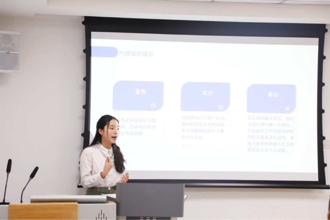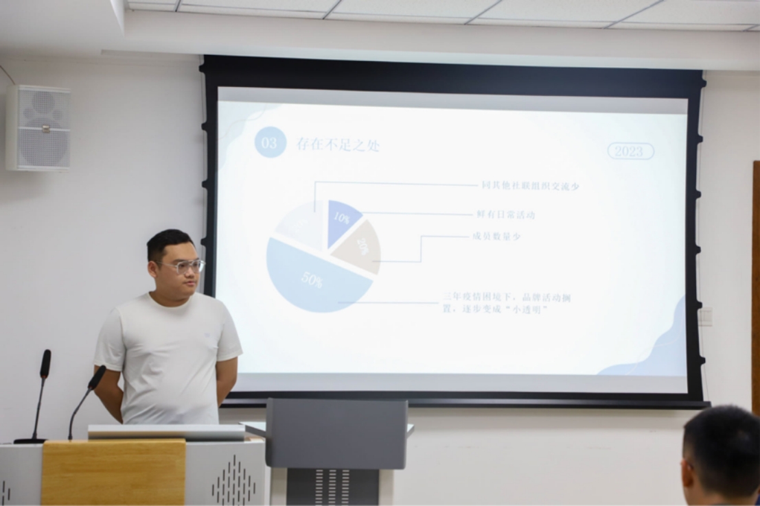 团委、学生会、新媒体与宣传中心、社团联合会和生活管理委员会主要学生负责人同学们依次上台进行工作汇报,对过去一年工作进行总结,同时向在场师生详细介绍了各自负责组织的人员构成、任务分工与新学年工作计划。