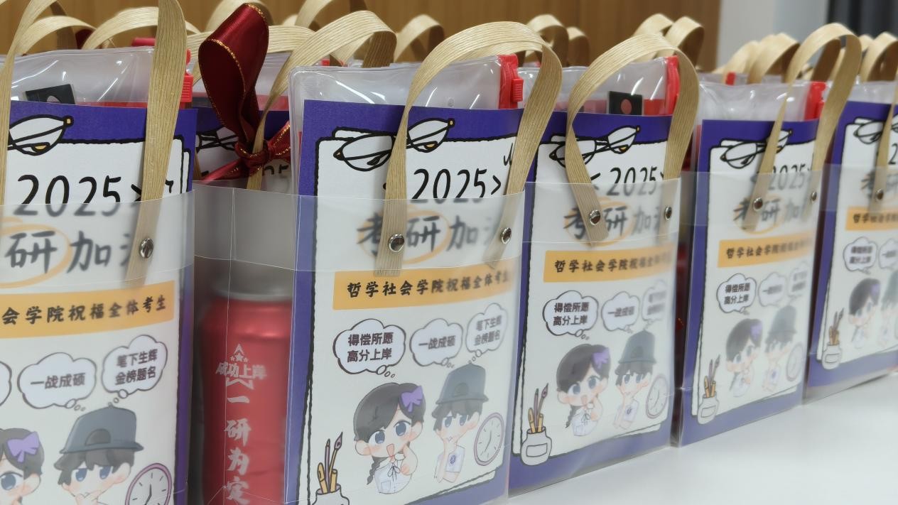 座谈会上,老师们首先分发了学院为大家制作的考研加油礼包,里面包含考试必备的文具套装等,同学们向老师们纷纷表示感谢,并将这份祝福和喜悦拍照留存和分享。