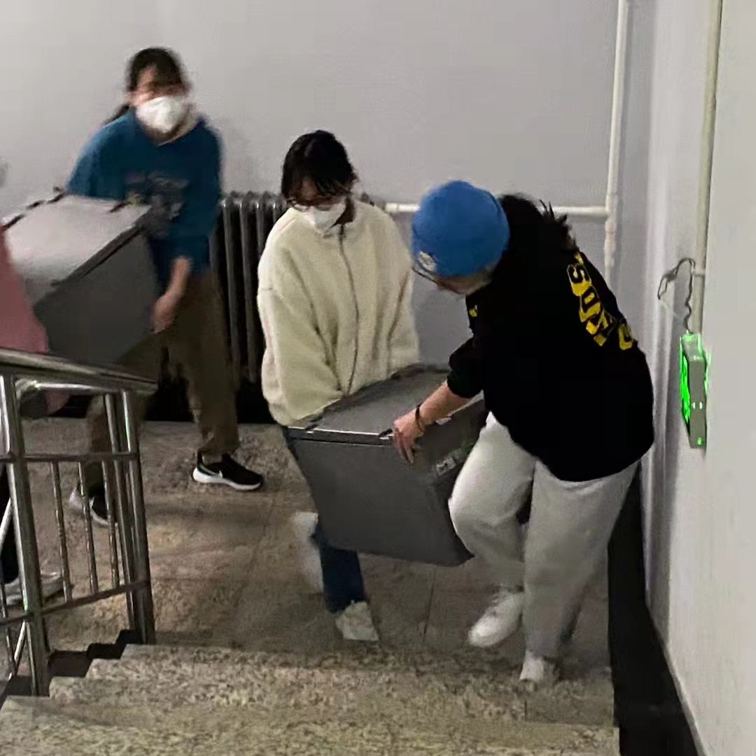 同学们迅速组成了一支近两百人的志愿者团队,女同学们巾帼不让须眉,瘦弱的身躯中爆发出强大的力量——几位志愿者需要搬着八个大箱子上到六楼,来回上上下下数十次——这些志愿者们一趟又一趟的忙碌,在室外零下几度的温度中,汗水打湿了衣服。在完成了自己的任务后,H视频