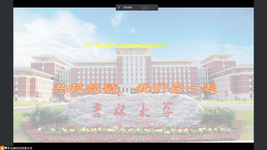 2021级应用心理学5班任睿哲同学讲解了目前学校的相关疫情防控政策和形势,并通过分享隔离管控后寝室里的种种趣事以及关于线上学习的经验鼓励大家保持良好心态,积极配合学校各项工作开展,助力疫情防控阻击战!