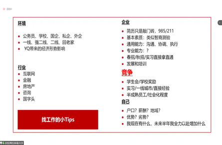 在分享的最后,孙悦博师兄向大家分享一些找工作的要点,向大家详细介绍了关于企业、环境、行业等方面应该做的准备,分析各行业领域可能存在的利与弊,提醒同学们在选择职业时要审慎思考、谨慎选择。