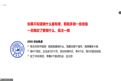 首先,孙悦博师兄向同学们分享了自己的求职历程。对处在毕业季的同学们来说,可能都有一些毕业焦虑,师兄表示他也不例外。但是正如他所说的,“如果不知道做什么最有用,那就多做一些准备”。因此,师兄提到,在面临毕业焦虑时他选择了培训讲课、企业实习、刷面试经验等方式为找工作做准备,利用一切闲暇的时间去学习、考证,做自己认为对的事情,抓住有限的机会,去尝试其他可能和了解新事物。他用自身经历向大家讲述了未来求职过程中可能出现的“坑”,提醒同学们要警惕这些不利因素。