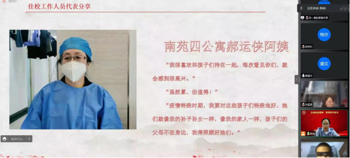 随后,南苑四公寓工作人员郝运侠阿姨向同学们分享了她的心声。郝阿姨讲述了自己在疫情封闭管理期间的工作:在疫情爆发初期,不顾个人安危入驻学校,与学生同吃同住、共同战斗;抗疫期间,每天工作10多个小时,进行消杀、分发三餐和防疫物资;当同学们身体和心理出现问题时,第一时间前往照顾,给予关怀。郝阿姨说,“我很喜欢和孩子们待在一起,疫情特殊时期,我要对这些孩子们特殊地好,她们就像我的孙子孙女一样,像我的家人一样,我得照顾好她们”。正是这种强烈的责任感与大爱,支撑郝阿姨完成抗疫任务,为我们树立了榜样。