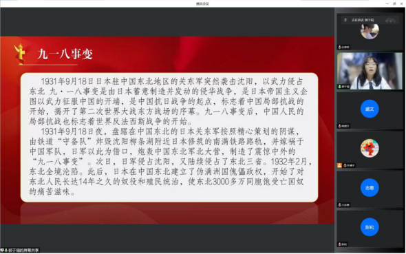 值“九·一八”事变九十一周年之际,为了让党史学习教育“映”入人心,为了加强学生对于“九一八”事变的深刻认识,牢记国耻,缅怀先烈,进一步强化当代大学生的爱国之心,争做饱含时代责任感,有理想、有本领、有担当的新青年,为将来投身于中华民族伟大复兴的事业坚定信念,牢记国耻,缅怀先烈,H视频