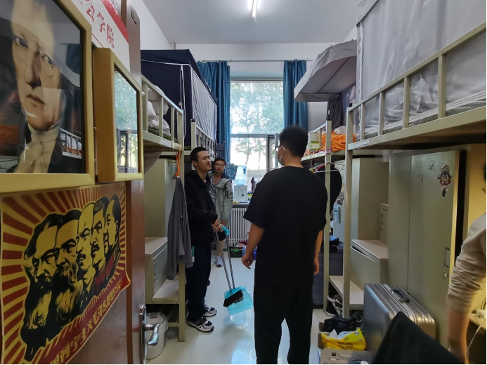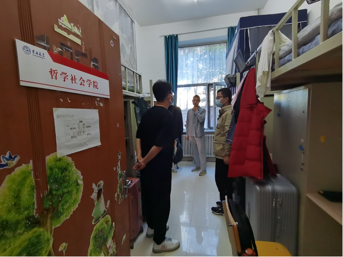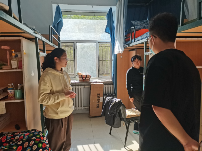 走进因疫情原因刚刚入校报到学生的寝室,宋老师和辅导员助理们从课程学习、生活适应、寝室关系等多个角度与新同学开展了积极交流,并重申了学校的相关纪律要求,提醒同学们尽快调整状态,积极融入群体,认真学习、快乐生活。
