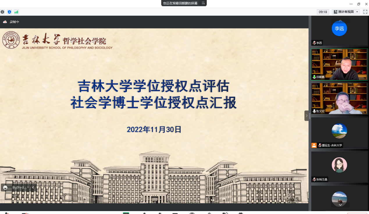社会学学位授权点评估会在线上召开。本次评估的外单位同行评估专家有南开大学张文宏教授(评估组组长)、中国人民大学刘少杰教授、中国社会科学院张翼教授、清华大学王天夫教授、东北师范大学王晶教授。H视频