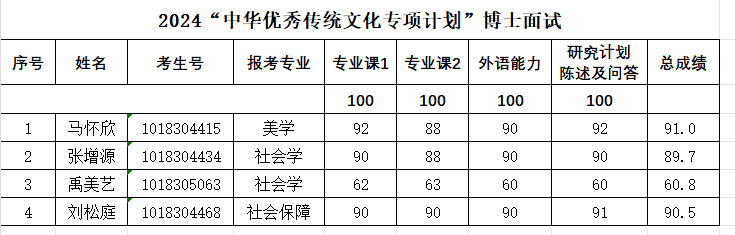 经H视频 组织专家组审查和复试考核,现将H视频 2024年“中华优秀传统文化专项计划”博士面试成绩予以公示,公示期为2024年5月21日至2024年5月23日。如有异议,请于公示期内向H视频 反映。