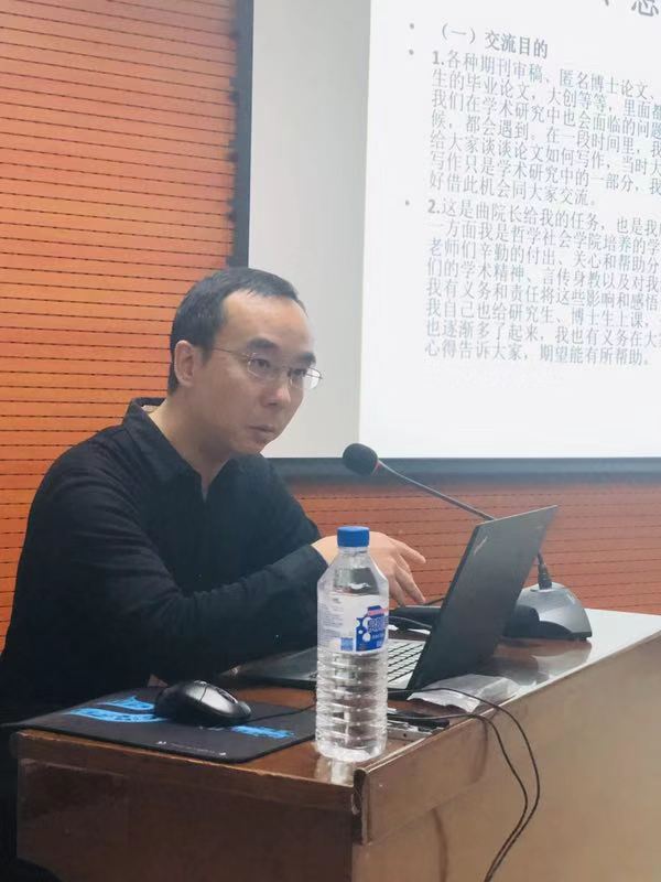 在讲座中,王立教授以读书、思考和写作为核心将自己在学术研究中的体会和心得娓娓道来。关于读书,王立教授认为对哲学史的熟悉是必要的,而经典和前沿性阅读兼顾是尤为重要的。在经典文本的阅读中,应该从整体开始逐渐进入细节,同时需要掌握前沿性文本的基本工具并锻炼筛选重要文本的能力。关于思考,王立教授强调要以相关文献作为思考的基础,这样能够保证相关的思考具有学术意义,而非胡思乱想;作者如何进行论证应该作为思考的重点,包括作者论证的逻辑起点、逻辑环节,支撑论证的理由、论证的自洽性等等,最后应该以构想一种更好的论证作为更高级的自我训练。关于写作,王立教授首先指出写作是学术研究的基本需要,然后就论文的选题提出了许多要求和建议。对于“如何写作”的问题,王立老师强调了“勤动笔”和“多模仿”的重要性,并指出在论文写作中应该以问题清晰、结构平衡、承接得当、论证严密、语言干净作为标准。王立教授还对投稿中的注意事项进行了具体的讲解。最后,王立教授提出学术研究中最重要的是勤奋、认真、专注的态度,并总结道:“如果你一辈子都在做一件你喜欢的事,必定有收获!”