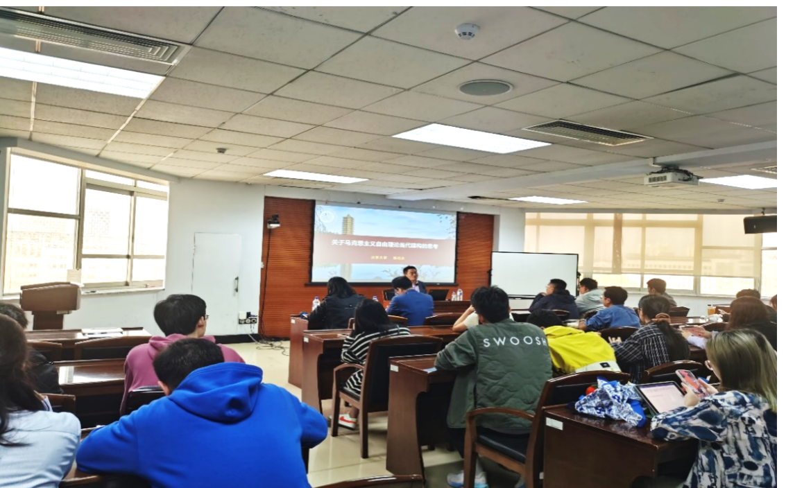 首先,陈培永教授提出做学问需要透过文字表象把握其内容思想,面向文本是青年学生走向学术之路的不二法门,面向时代是青年学者应当努力的方向。围绕“马克思主义自由理论的当代建构”这一主题,讲座内容主要分为四个部分:其一,从“赋权性自由”到“权能性自由”的阐释。陈教授指出不仅要强调人们自由的权利,还要赋予自由的能力,要保障大多数人自由的物质基础,以及自由的身体和生命前提。其二,陈教授通过阐释马克思的经典论断——“人的本质是一切社会关系的总和”,提出将人理解为“关系性个体”,而非“独立性个体”。其三,面对“资本逻辑已经成为制约现代人自由的主要因素”这一社会现实,陈教授提出“公权力塑造”不一定是“必要的恶”,我们需要强有力的“公权力”保障大多数人的自由。其四,借助马克思的共同体思想,陈教授表明只有在“真正的共同体”的基础上,才有可能实现普遍的自由。