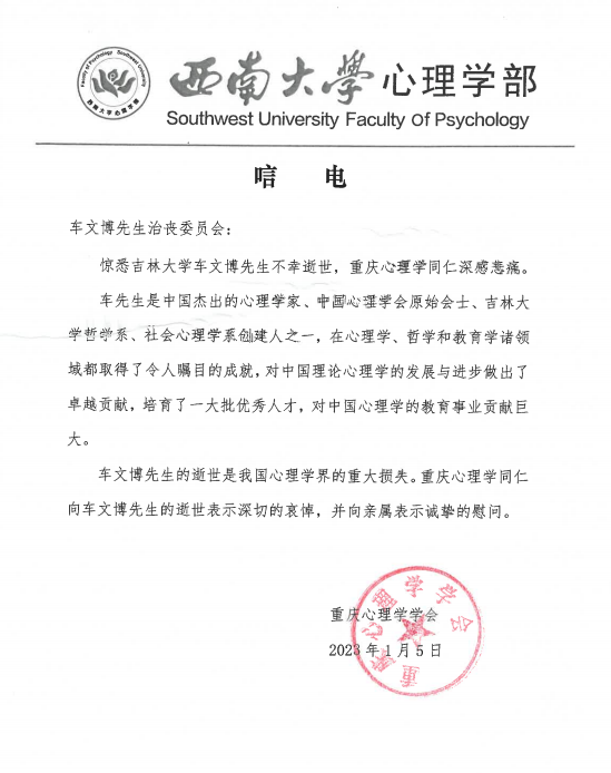 重庆心理学学会唁电