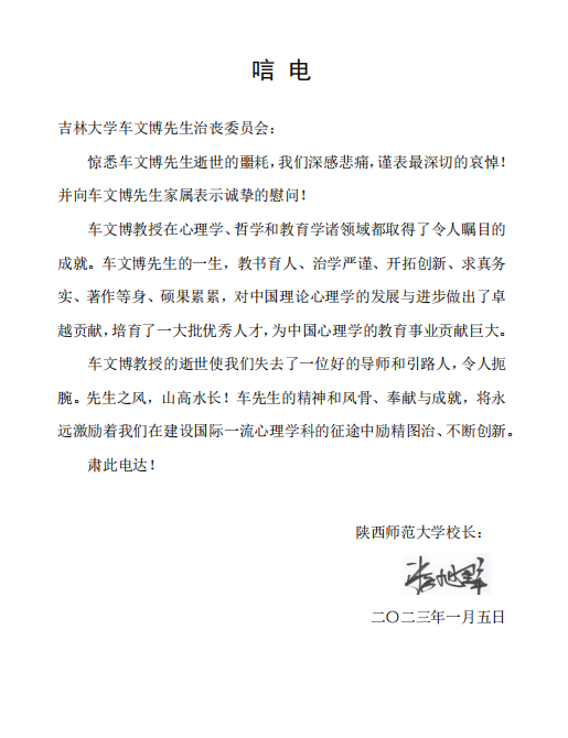 陕西师范大学游旭群校长唁电